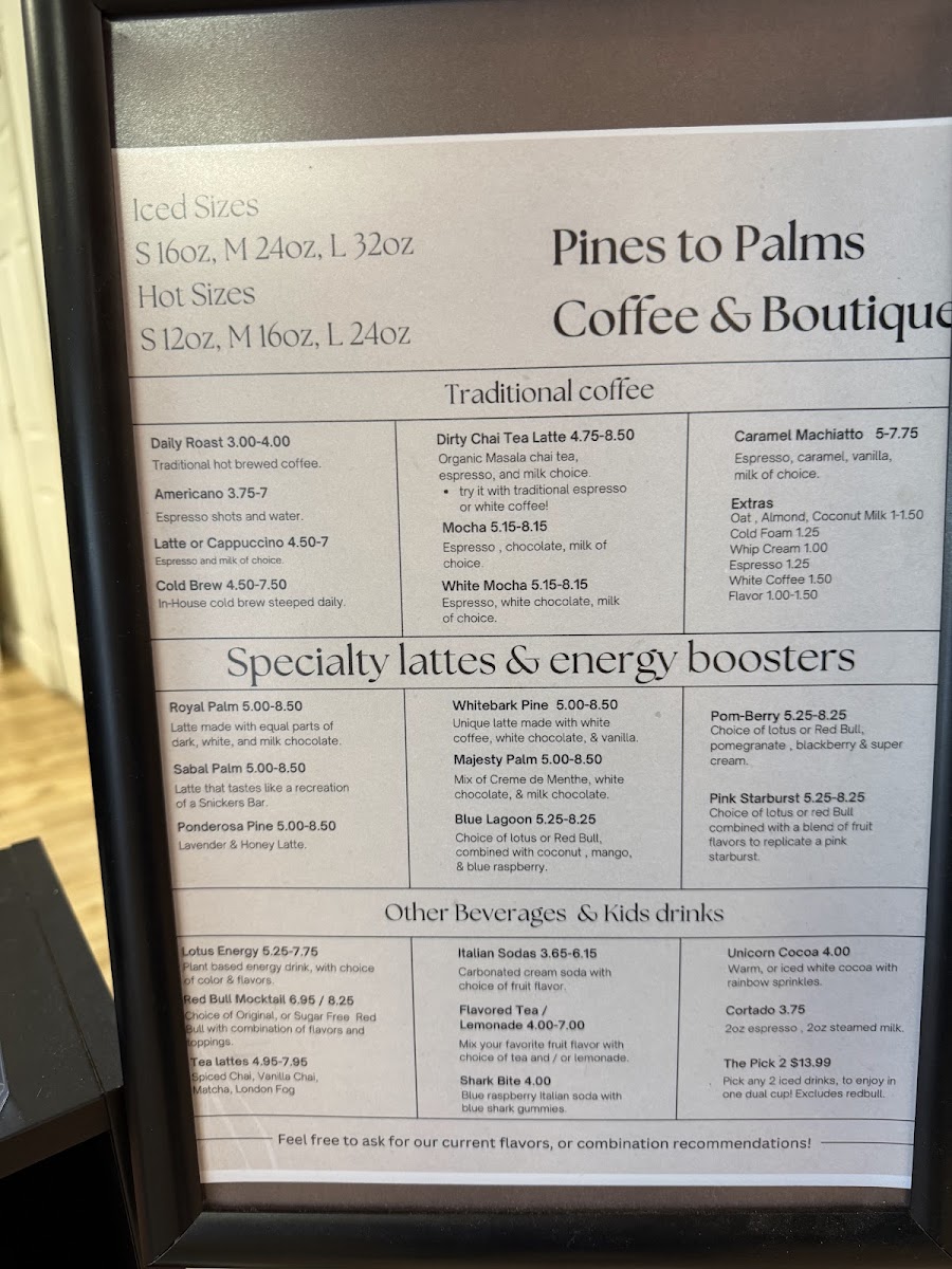 The menu at Pines To Palms Coffee Menu offers a refreshing variety of beverages perfect for any time of day. Whether you're stopping in for a quick caffeine fix or looking to relax with a cozy drink, there’s something for everyone. From expertly brewed coffees to rich lattes and smooth cold brews, each cup is crafted with care. They also serve delicious pastries that pair perfectly with your drink, making it a great spot for a light breakfast or afternoon snack. Whether you're a regular or a first-time visitor, the warm, inviting atmosphere makes it easy to unwind and enjoy.